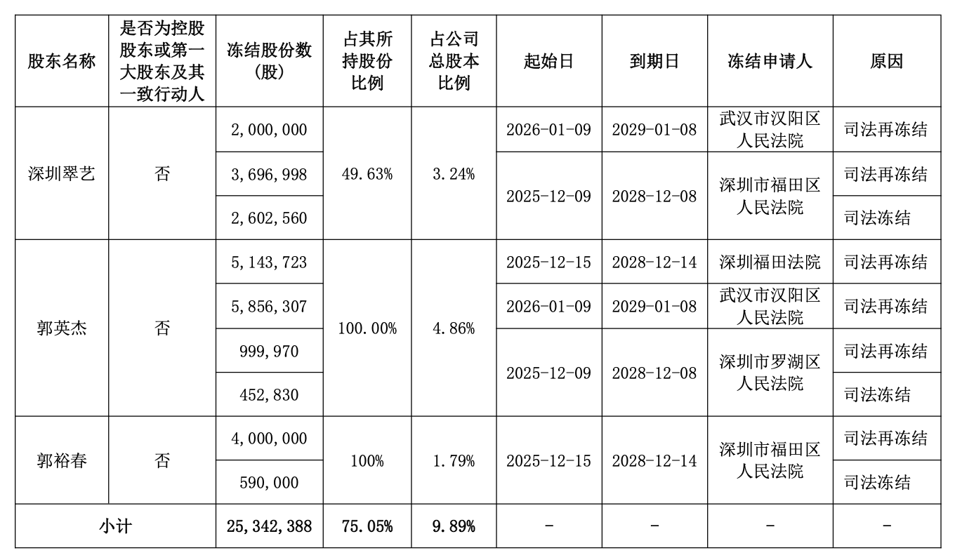随后,萃华珠宝披露《关于持股5%以上股东股份被司法冻结、司法再冻结及轮候冻结的公告》,称于近日收到持股5%以上股东深圳翠艺及一致行动人通知,并通过中国证券登记结算有限责任公司深圳分公司系统查询,获悉深圳翠艺、郭英杰、郭裕春所持有的公司部分股份被司法冻结、司法再冻结及轮候冻结。