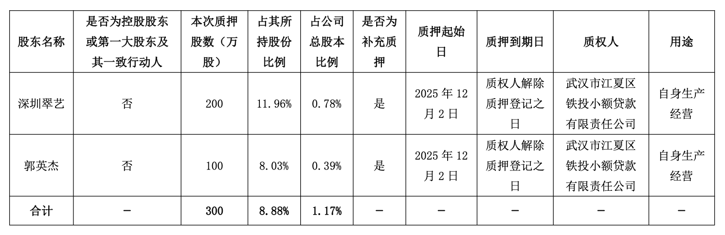 公告称,深圳翠艺及一致行动人本次办理的股份质押,为其自身资金安排需要,本次事项不会对公司生产经营、公司治理产生影响,其所持有公司股份不涉及业绩补偿义务。
