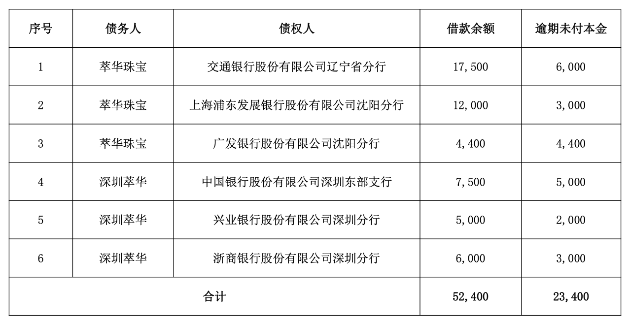 1月28日,萃华珠宝公告称,公司及子公司深圳市萃华珠宝首饰有限公司(简称“深圳萃华”)由于部分流动资金紧张,出现部分借款未能如期偿还的情形。截至公告披露日,公司及深圳萃华在银行等融资机构的借款逾期本金为2.34亿元。
