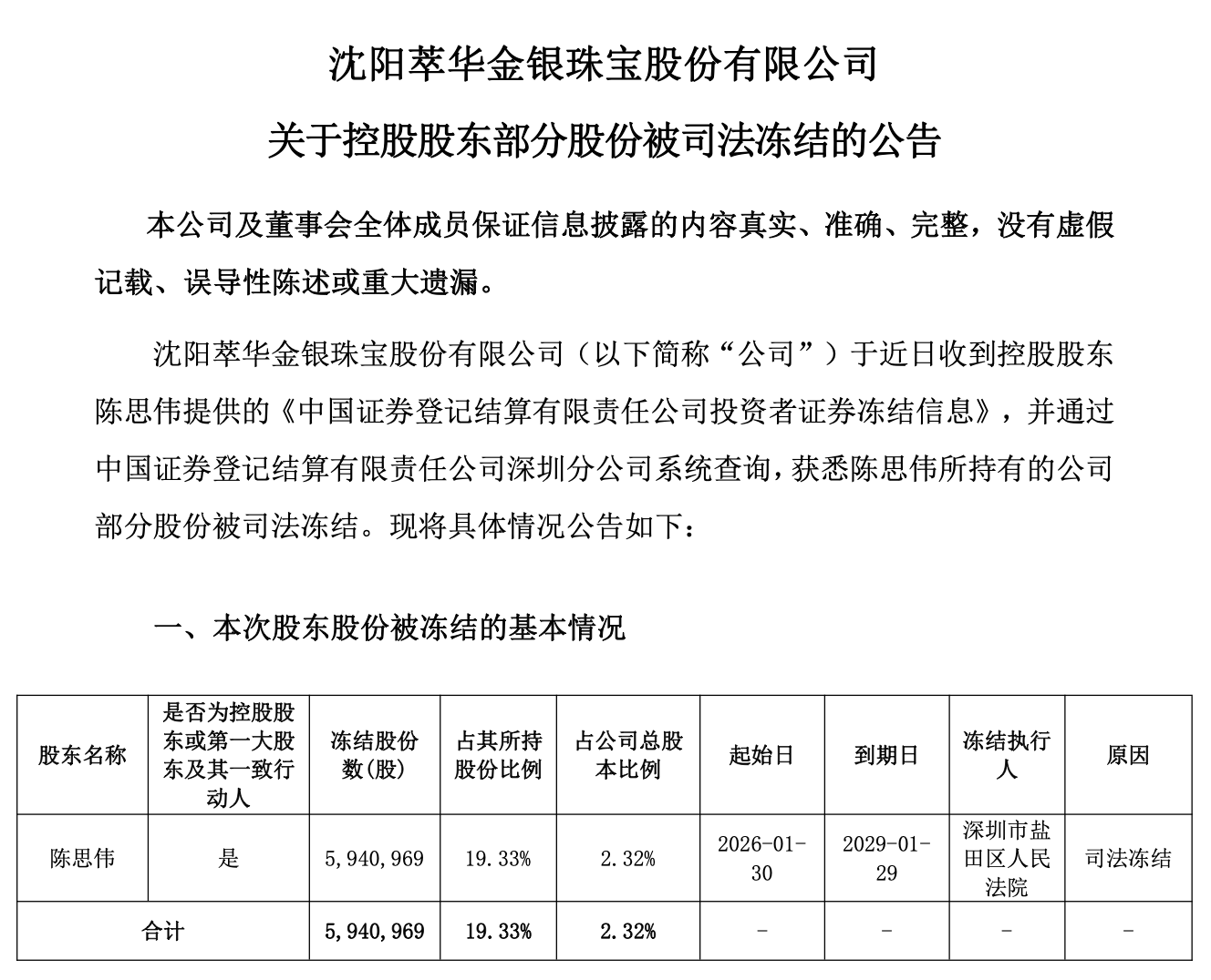 公告显示,陈思伟为萃华珠宝第一大股东及其一致行动人,冻结股份数594万股,占其所持股份比例19.33%,占公司总股本比例2.32%,冻结自2026年1月30日起,2029年1月29日止。