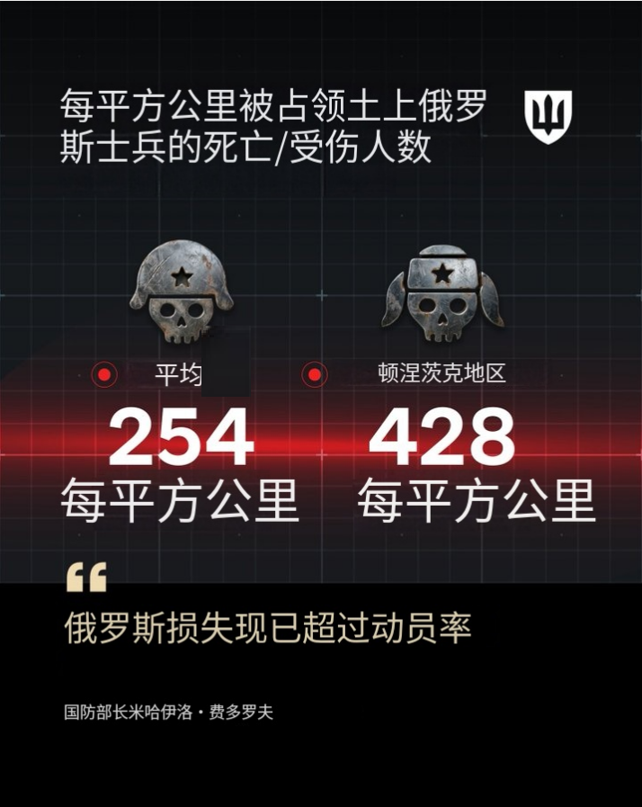 乌克兰国防部长称,如今俄罗斯军人的损失速度超过了补充速度,平均每占领一平方公里,伤亡就达到了254人,而在顿涅茨克低区,这一数字达到了428。