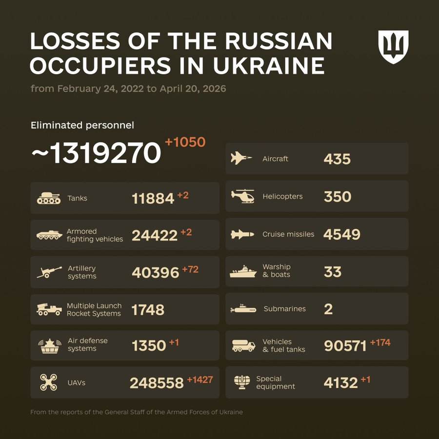 乌总参公布的昨日战果,歼敌(击毙+重伤)1050人。