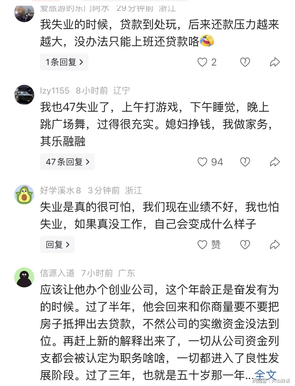 针对此事,有网友表示,我也47失业了,上午打游戏,下午睡觉,晚上跳广场舞,过得很充实。媳妇挣钱,我做家务,其乐融融。