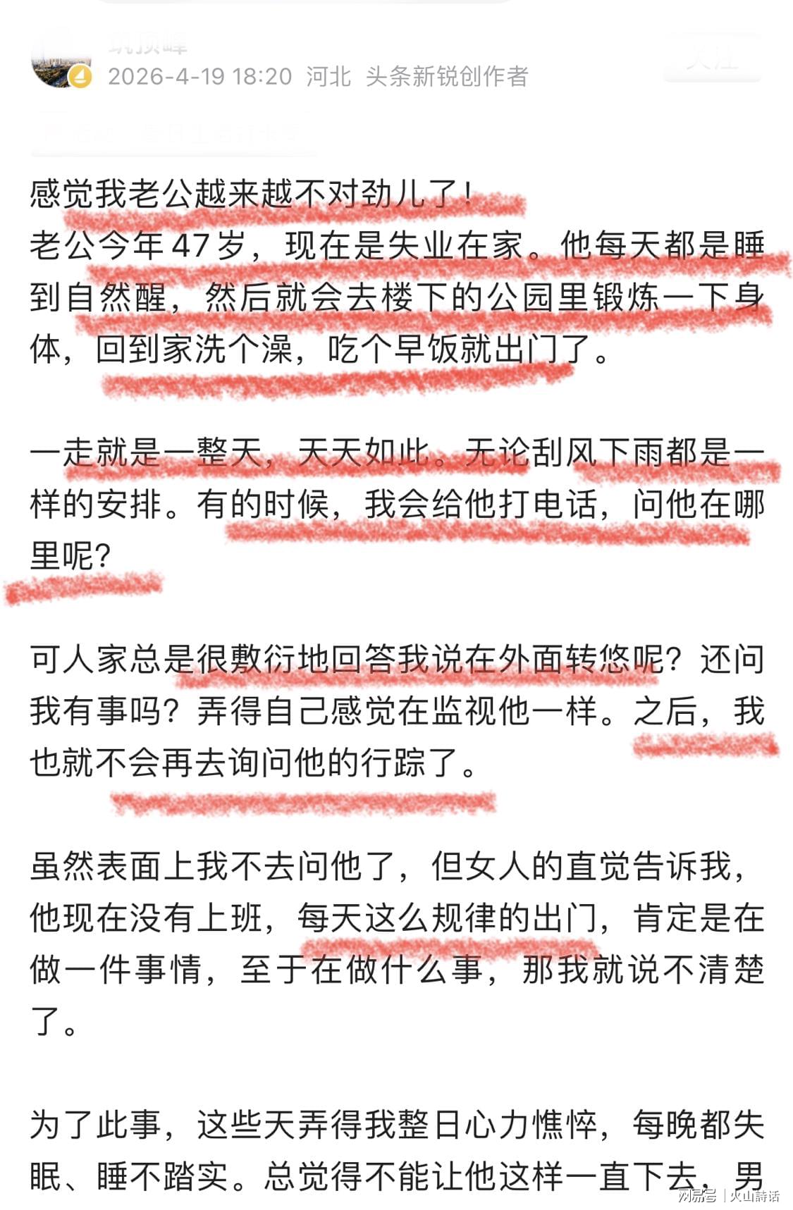 近日,一位河北网友发帖倾诉心事,引发众多中年家庭共鸣。据她描述,47岁的丈夫失业在家后,生活却异常规律:每天睡到自然醒,下楼锻炼、洗澡吃完早饭后便出门,一走就是一整天,风雨无阻。面对妻子的电话询问,丈夫总是敷衍回应“在外面转悠”,态度疏离,让她倍感不安。